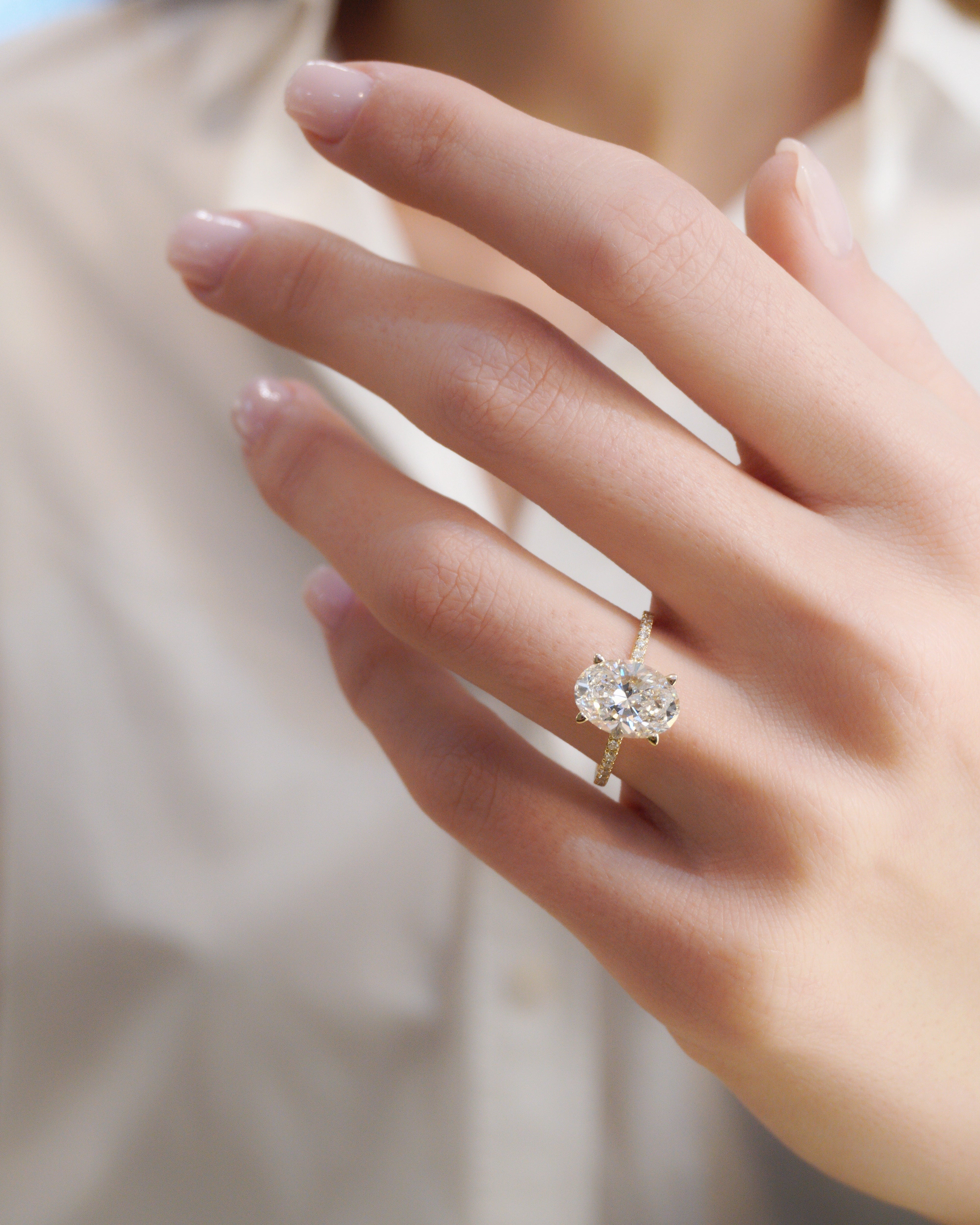 Olivia ოვალური ჭრის 3.00 კარატიანი ბრილიანტი ოქროს რგოლზე - სილუეტი, რომელიც უკლებლივ ყველას ხიბლავს მისი მარადიული მიმზიდველობის გამო.