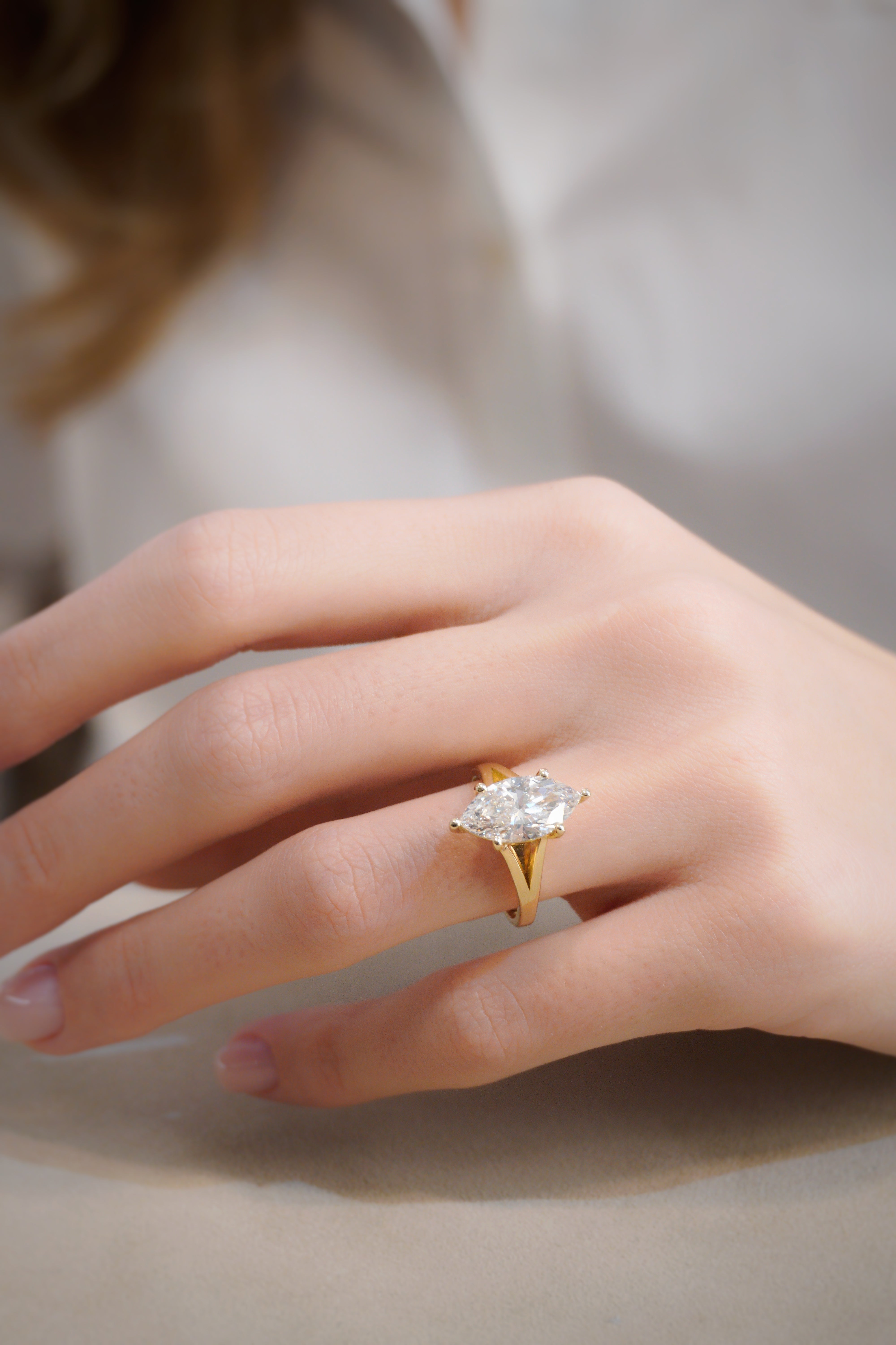 A grand silhouette with timeless elegance - The Martha Cathedral Ring features a striking 3.00 carat marquise-cut diamond elevated in a graceful cathedral setting, drawing the eye upward and amplifying its natural brilliance.