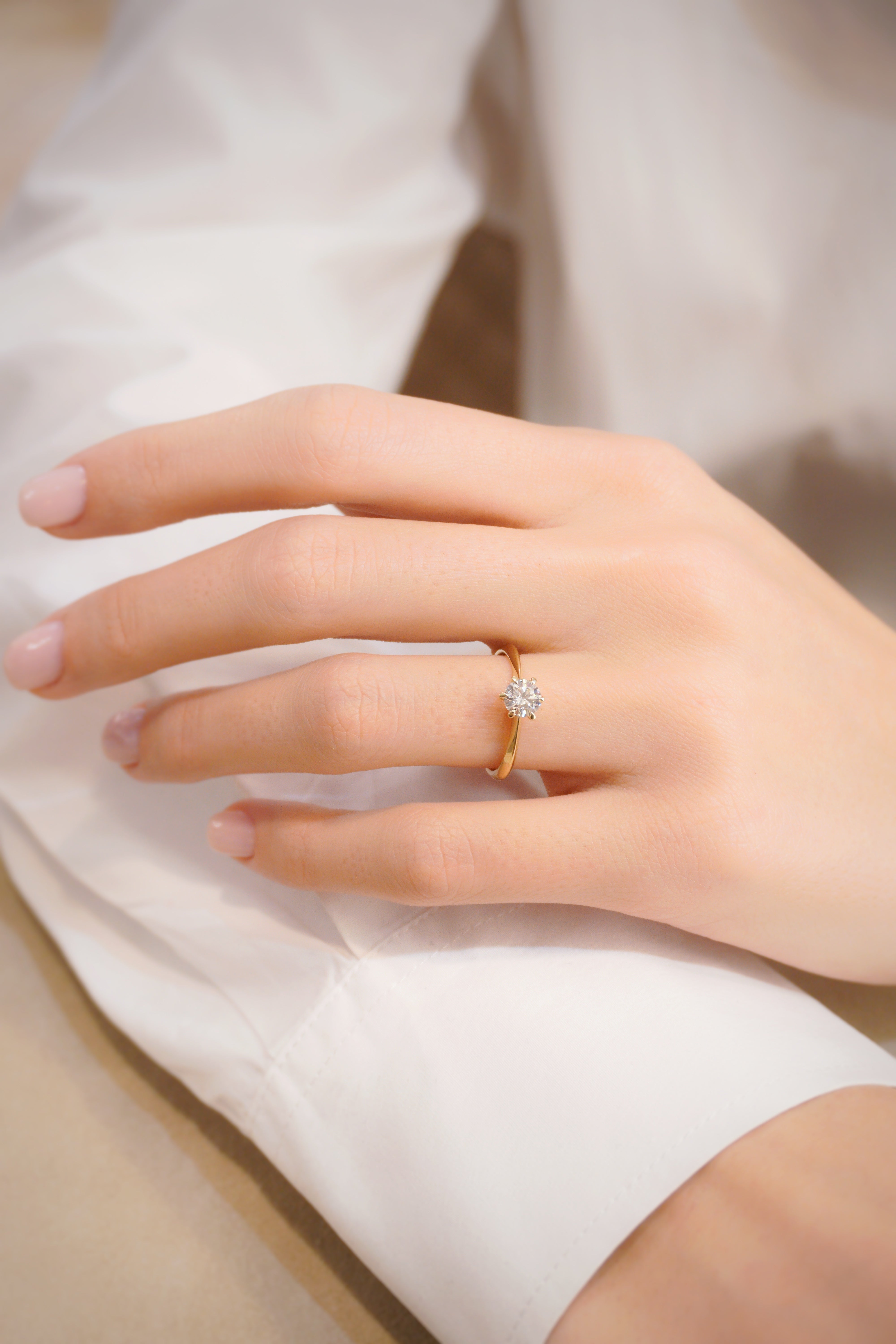 The Regina Engagement Ring features a round-cut diamond set in six refined prongs, giving the centre stone a perfectly balanced, classic look. Paired with a smooth gold band, the design feels effortlessly elegant and enduring—one of our most beloved rings for good reason. A true timeless beauty.